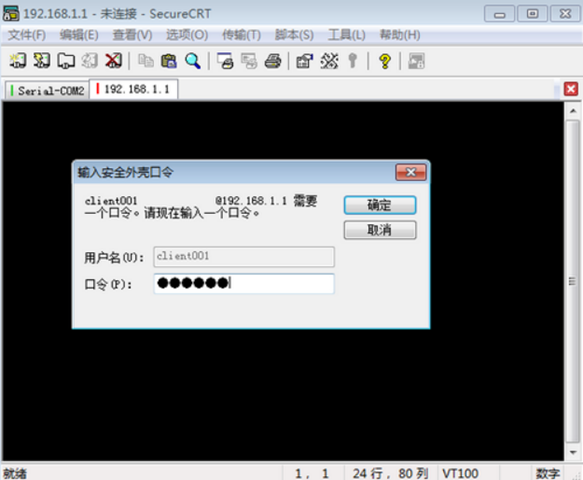 单击<Open>按钮。按提示输入用户名client001及密码aabbcc,即可进入Switch的配置界面。
