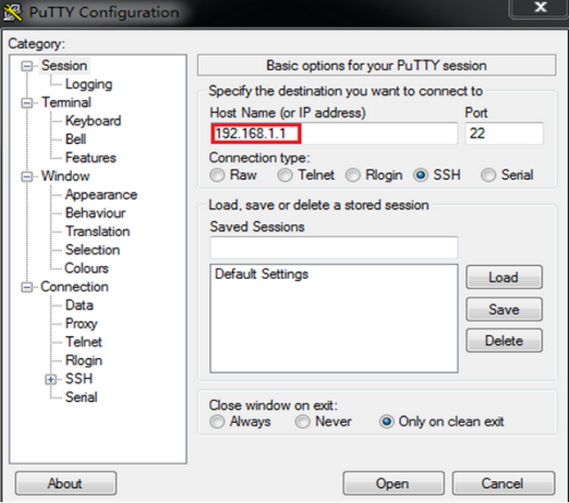 打开PuTTY.exe程序,出现如图所示的客户端配置界面。在“Host Nameor IP address)”文本框中输入SSH服务器的IP地址192.168.1.1