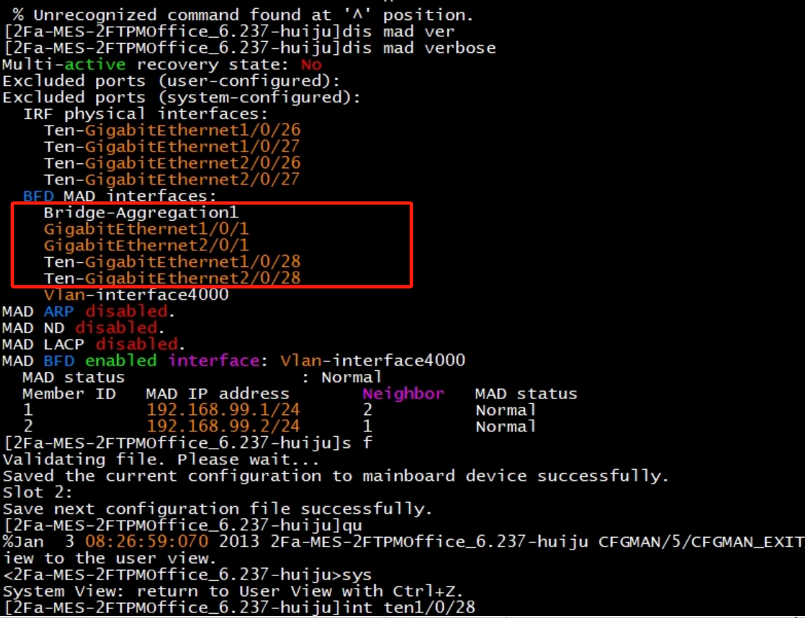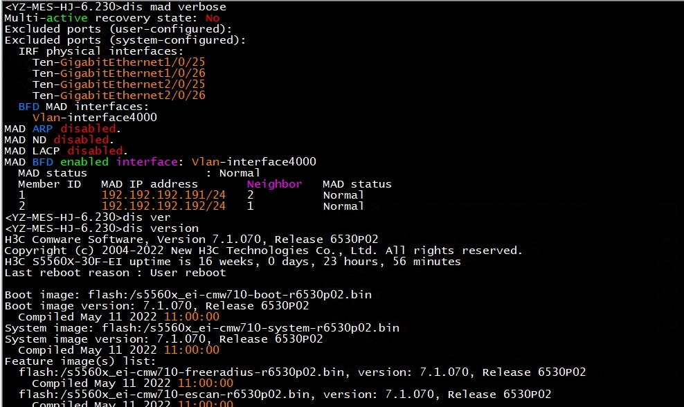 交换机配置BFD,查看display mad verbose ,发现 BFD MAD interfaces把设备的接口都加进来了,这个什么问题,这些接口下都是方通vlan all,BFD检测vlan 4000,其他型号交换机的配置也是vlan all,没有这种情况出现,正常只有BFD检测vlan(图一为正常的,图二为异常),目前怀疑和版本有关,异常的交换机版本较老,有大神知道原因吗