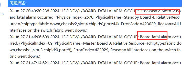 %Jun 27 21:48:06:521 2024 H3C DEV/1/BOARD_FATALALARM_OCCUR: -Chassis=2-Slot=3; Board fatal alarm occurred. (PhysicalIndex=2569, PhysicalName=Master Board 3, RelativeResource=(chiptype:fabric down,chassis:2,slot:3,chipid:0,port:8), ErrorCode=423029, Reason=All interfaces on the switch fabric went down.)