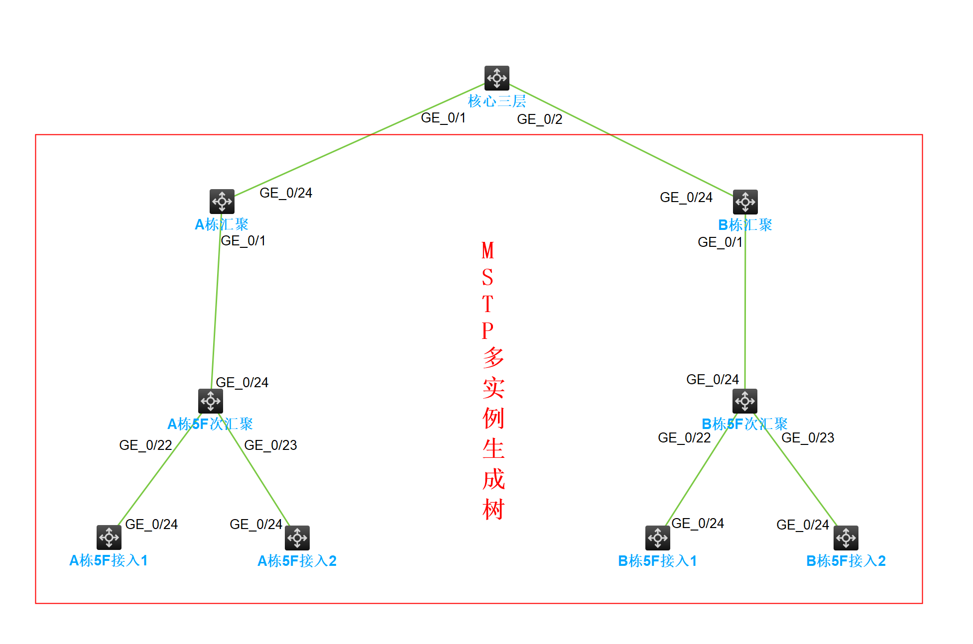 这是公司的网络结构图,核心三层交换机在某栋大楼的中心机房,通过光纤连接到各个楼栋的分机房汇聚交换机,然后通过网线连接到各个楼层的次汇聚交换机,最后通过网线连接到接入交换机;由于未做STP生成树配置,经常会有用户乱接网线导致网络环路瘫痪!现在的需要求想通过配置MSTP协议来解决二层环路问题(汇聚、次汇聚、接入),当用户再次乱插网线造成网络环路时,各个交换机能够快速堵塞环路的网线,并保证网络稳定。