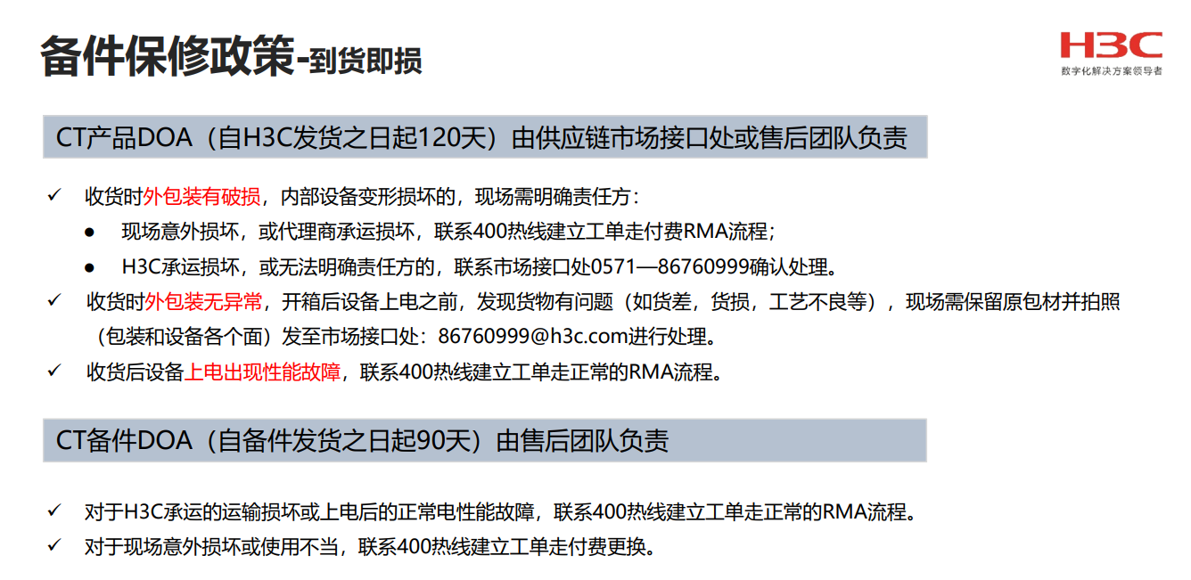 • 对于到货即损设备,H3C公司将在二(2)个工作日内发出新件,对发生到货即损的设备或部件进行快速更换。
