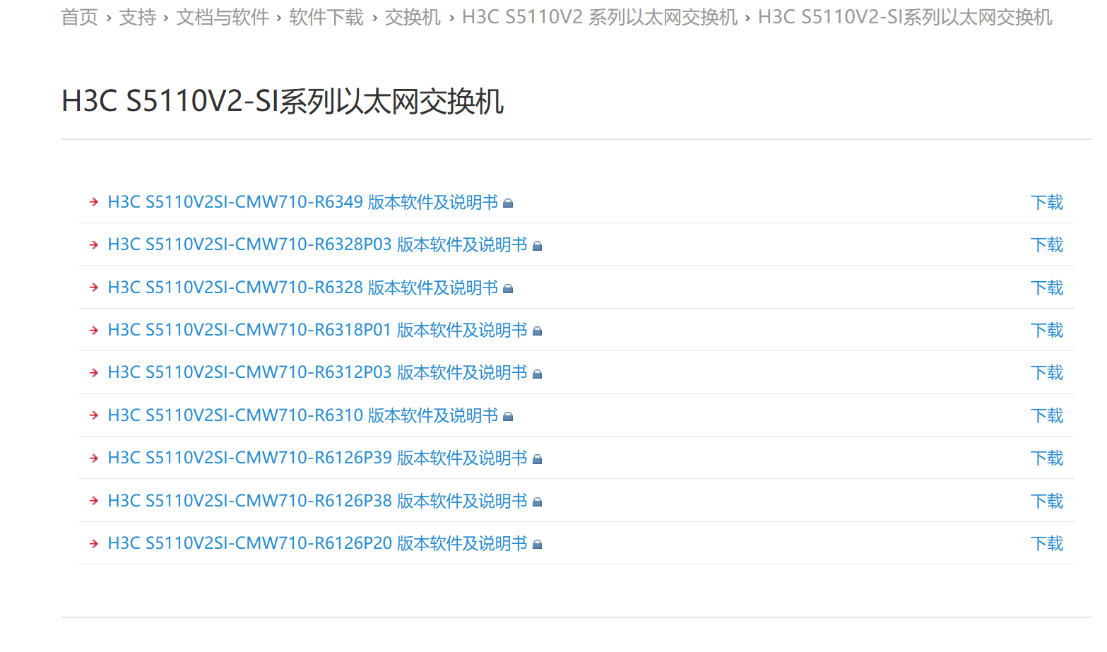 官网只有文档中心,没有软件下载列表,找不到全部版本,侧边栏也只有三个版本。https://www.h3c.com/cn/Service/Document_Software/Document_Center/Switches/Catalog/S5110/S5110V2-SI/Default.htm