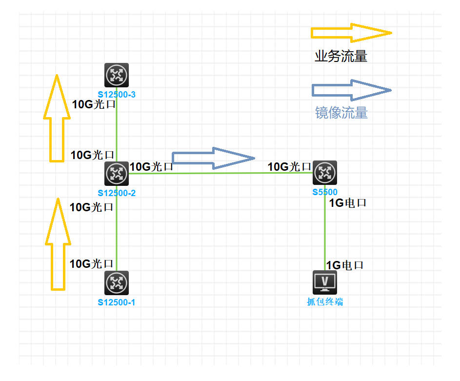 只有中继交换机(S5500)再次将自己10G光口流量镜像到1G电口上,抓包终端才能捕获业务流量。