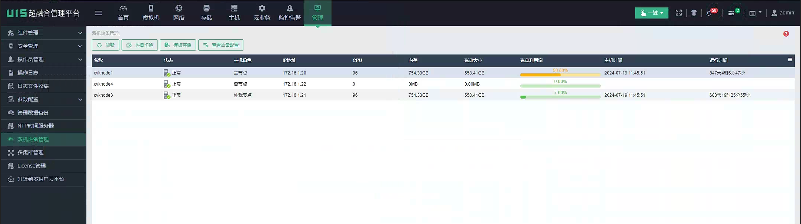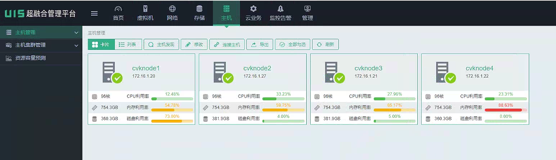 主动连接主机也是提示连接主机失败,主机4上的业务暂时没有影响。可正常登录cvknode4节点后台,存储健康度100%,后台执行df -h命令系统无显示,卡住了,Tomcat8 启动失败,无反应 uis-core未运行、无法运行。
