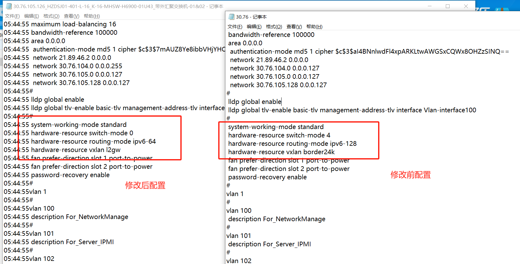 带外汇聚设备上起了OSPF和利旧资源池的带外管理核心设备互联,然后利旧的管理核心交换机对1107网发布bgp路由,这段路由就是新申请的带外地址段。有一个奇怪的现象是,bgp路由发布后,从其它资源池ping网络设备30.76.105.126和105.254网关可以通,再ping服务器设备30.76.104.254网关就不通了。但是服务器主机的带外地址可以通,比如30.76.104.11等等主机地址,但也是一部分主机地址可以通,一部分不通。中间的ospf路由状态是正常的,bgp状态也是正常的。最后把带外汇聚设备,这里配置修改成默认的后,服务器的网关地址就可以ping通了,这是什么情况呢?
