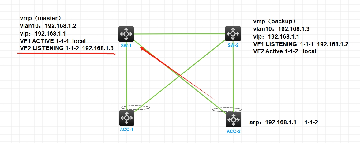 现网两台设备组m-lag,做的vrrp负载均衡,分别为SW-1和SW-2,下游有两台接入ACC-1和ACC-2,ACC-1通vrrp的虚ip,ACC-2不通,在ACC-2上看arp表项关于网关192.168.1.1的mac地址为1-1-2,这个是SW-2的虚拟转发器mac,但是用ACC-2去ping vip做流统发现流量不会走到SW-2,而是去到SW-1,去到SW-1后SW-1没有回包,这里不通是不是跟1-1-2这个mac在SW-1这里是监听状态有关?