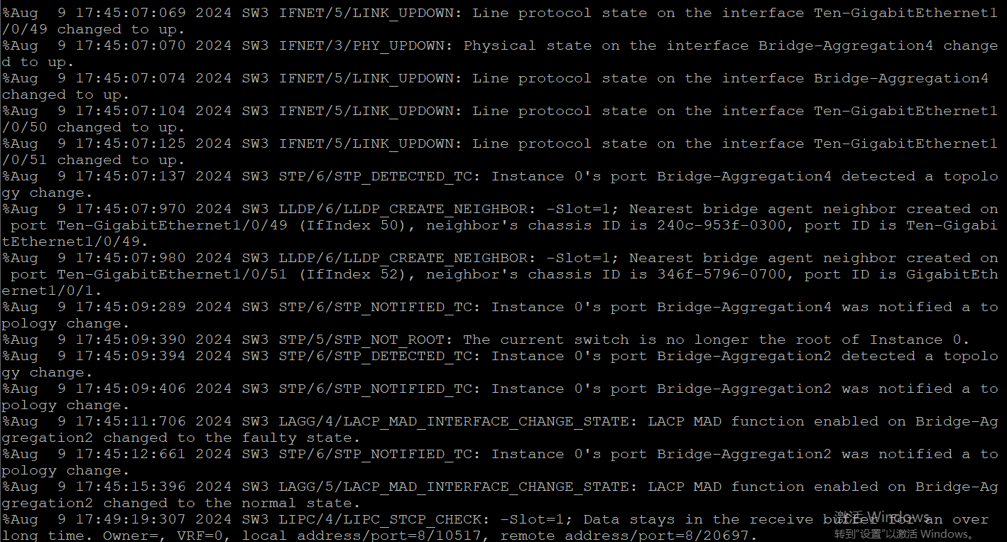 如图,汇聚层两台sw配置了irf,功能也正常,我用PCping外网也能正常ping通,当我测试将sw3断电之后sw4也能正常上线,但是pc却ping不通外网了,我尝试SW4pingPC也通不了有几个报错提示,我也不太懂是啥意思,好像是关于stp的我截取了一部分:大佬帮我看一看呀,谢谢了