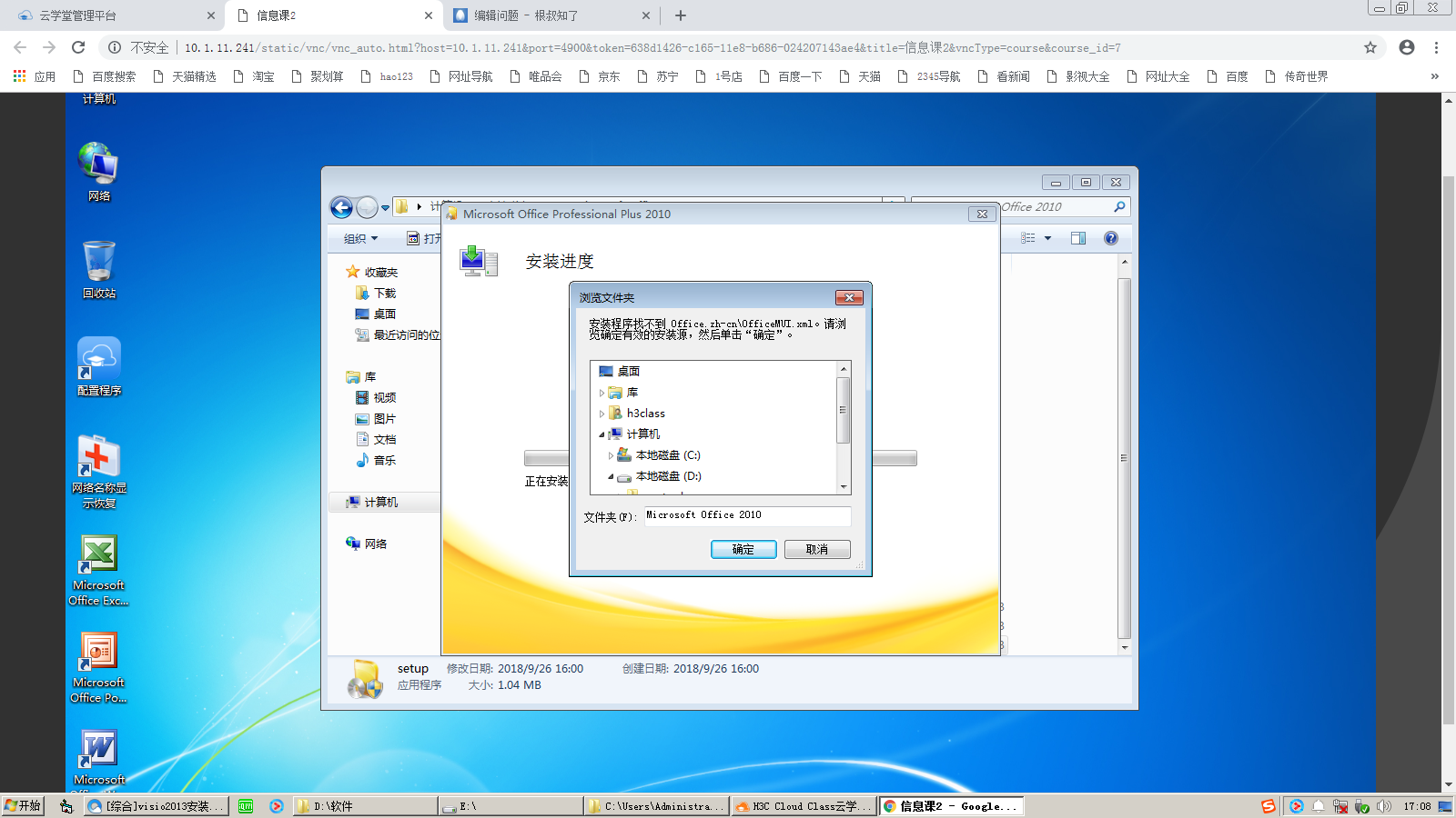 如题,云学堂里,上传安装包到FTP服务器,安装包可正常运行安装在别的电脑上使用,在网页管理平台上对课程进行软件安装,OFFICE版本为2007,或者2010,都有过尝试,安装刚开始即提示缺少文件无法安装,如图所示。实际安装包内有相关文件。不知道是什么问题。安装时以管理员身份运行安装程序。