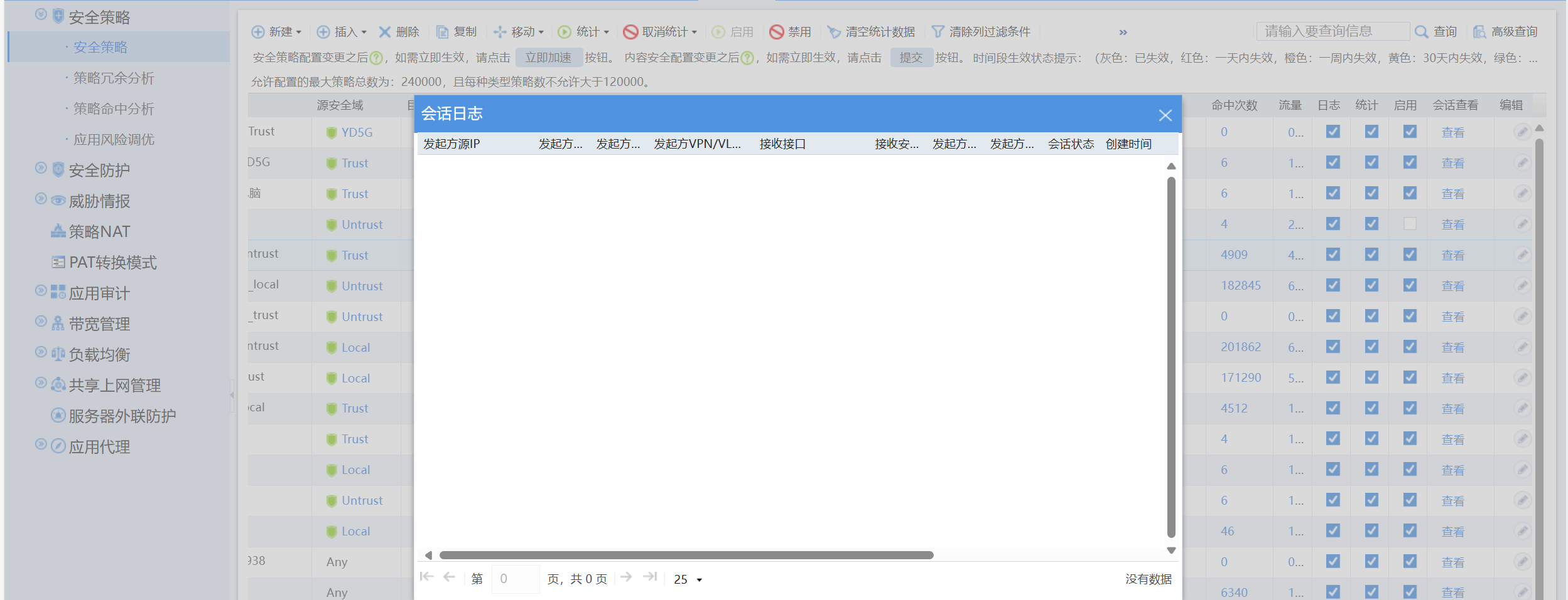 安全策略里面的会话没显示,这个要在哪里设置