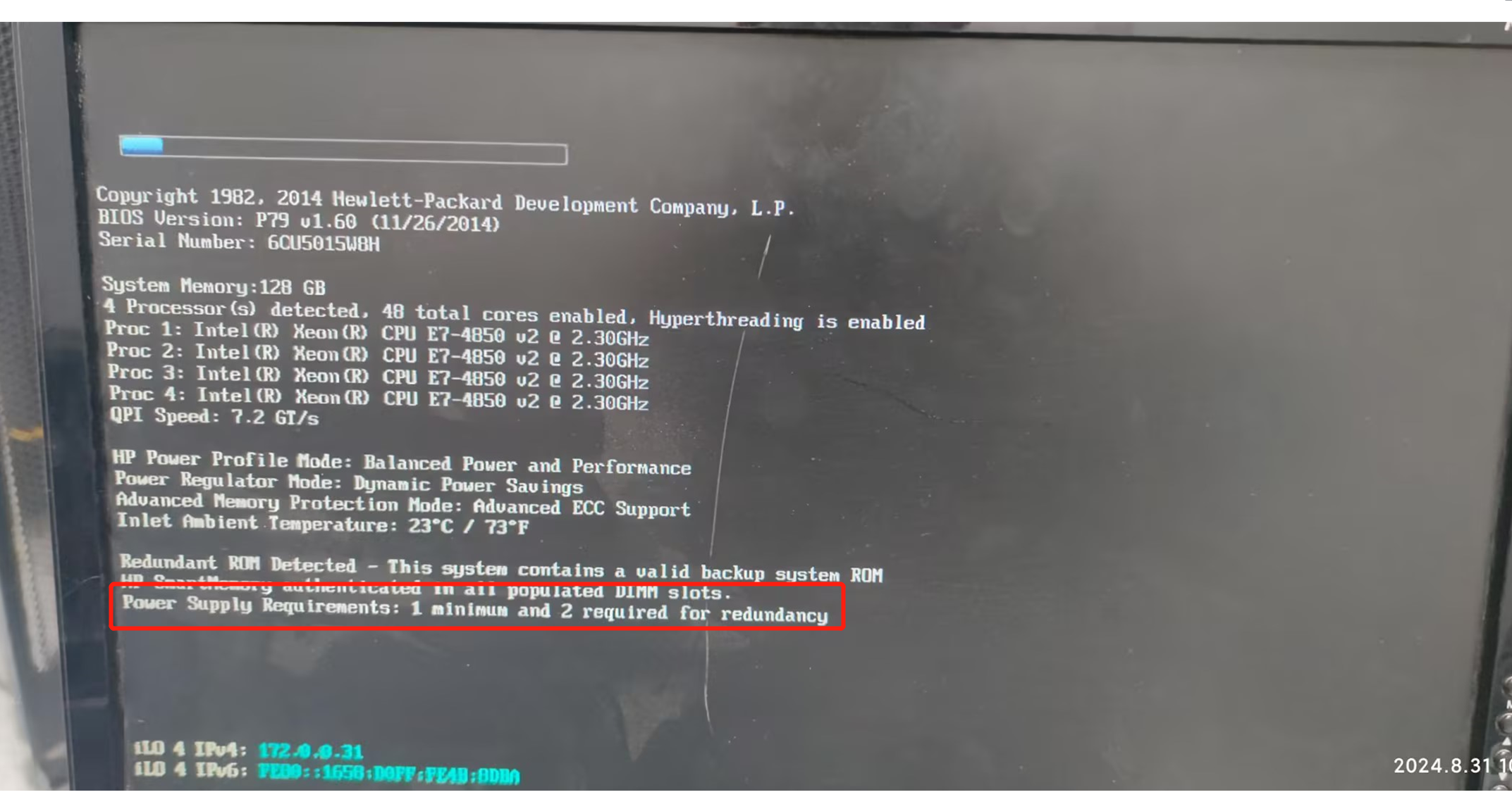 一台老旧的FlexServer R690 进行搬迁,但是搬迁后,自检完成一直停留在自检画面,并提示:Pouer Supply Requirenents: 1 minimum and 2 required for redundancy;具体见下图。