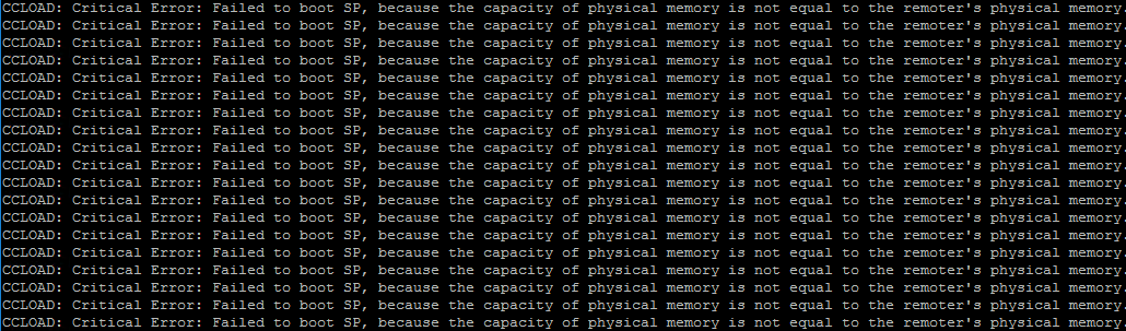 CCLOAD: Critical Error: Failed to boot SP, because the capacity of physical memory is not equal to the remoter's physical memory.
