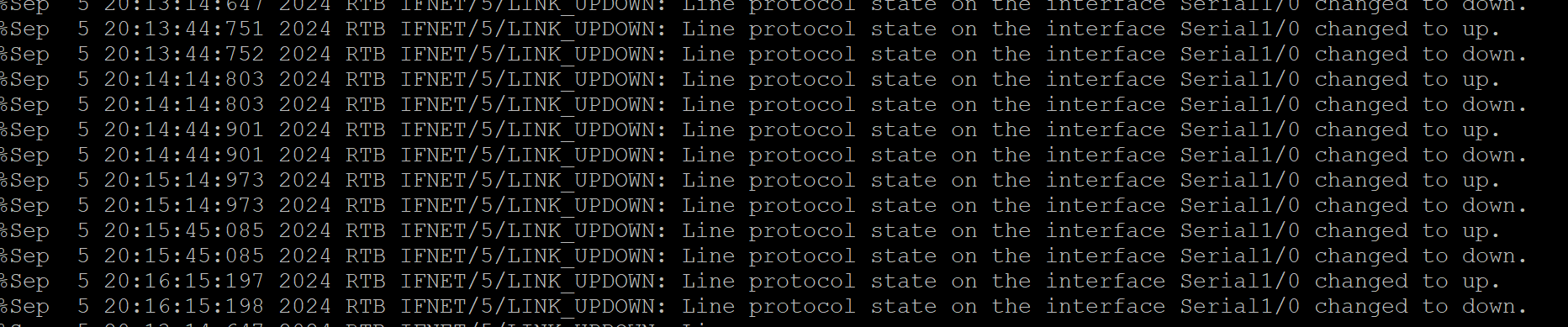 %Sep 5 20:13:14:647 2024 RTB IFNET/5/LINK_UPDOWN: Line protocol state on the interface Serial1/0 changed to down.