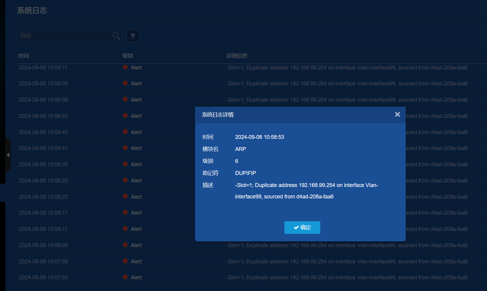 -Slot=1; Duplicate address 192.168.99.254 on interface Vlan-interface99, sourced from d4ad-208a-faa6