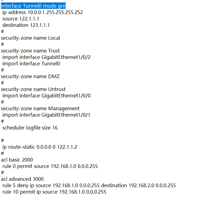 interface GigabitEthernet1/0/0 port link-mode route combo enable copper ip address 122.1.1.1 255.255.255.252 manage ping inbound manage ping outbound ipsec apply policy zongbu acl advanced 3000 rule 5 deny ip source 192.168.1.0 0.0.0.255 destination 192.168.2.0 0.0.0.255 rule 10 permit ip source 192.168.1.0 0.0.0.255 ipsec transform-set zongbu_IPv4_1 esp encryption-algorithm 3des-cbc esp authentication-algorithm sha256 # ipsec policy-template zongbu 1 transform-set zongbu_IPv4_1 local-address 122.1.1.1 ike-profile zongbu_IPv4_1 # ipsec policy zongbu 1 isakmp template zongbu # ike profile zongbu_IPv4_1 keychain zongbu_IPv4_1 exchange-mode aggressive match remote identity address 0.0.0.0 0.0.0.0 match local address GigabitEthernet1/0/0 proposal 1 # ike proposal 1 encryption-algorithm 3des-cbc dh group5 authentication-algorithm sha256 # ike keychain zongbu_IPv4_1 match local address GigabitEthernet1/0/0 pre-shared-key address 0.0.0.0 0.0.0.0 key cipher $c$3$QxKQDQWBTiOvEwSkfLNp6hDgrnp6Zg==