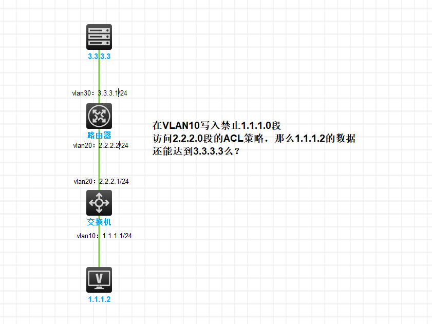 在VLAN10写入禁止1.1.1.0段访问2.2.2.0段的ACL策略,那么1.1.1.2的数据还能达到3.3.3.3么?