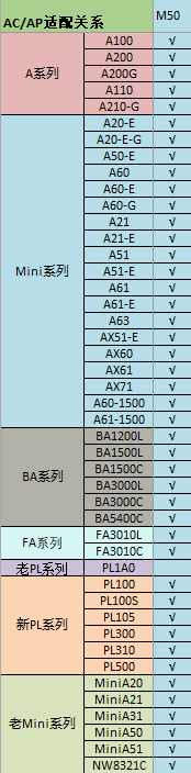 M50可管理的AP有A系列,Mini系列,BA系列,FA系列,新PL系列,老Mini系列。请在下图中查看详细AP型号。