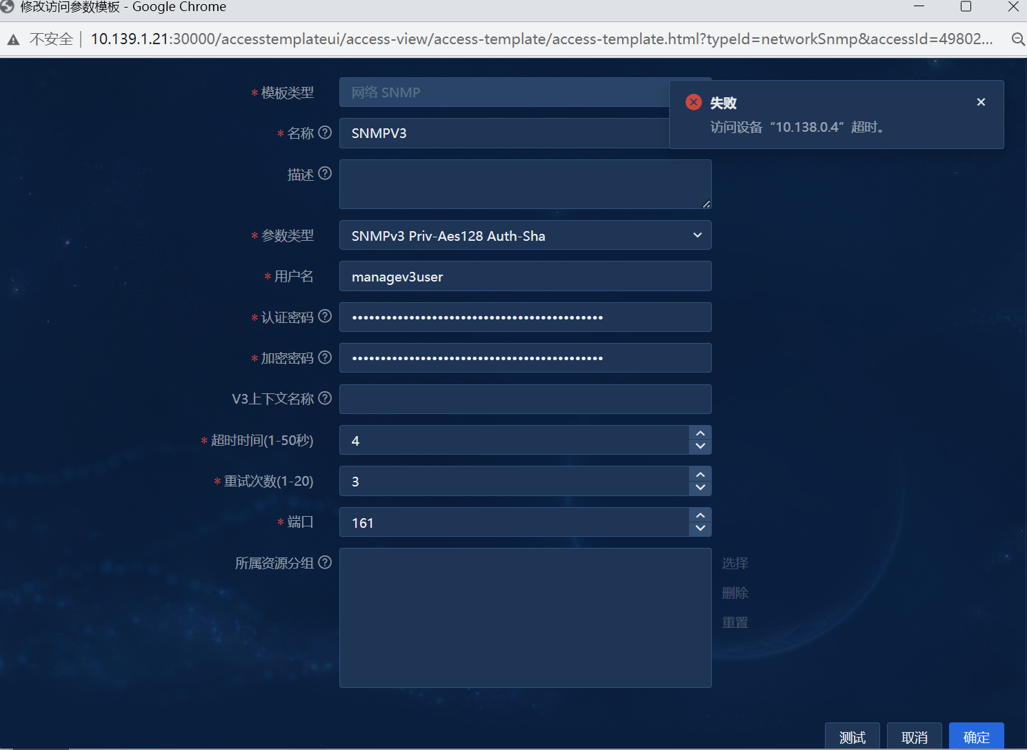 3、检查SNMPV3的纳管参数在网管平台和设备的配置是否一致。