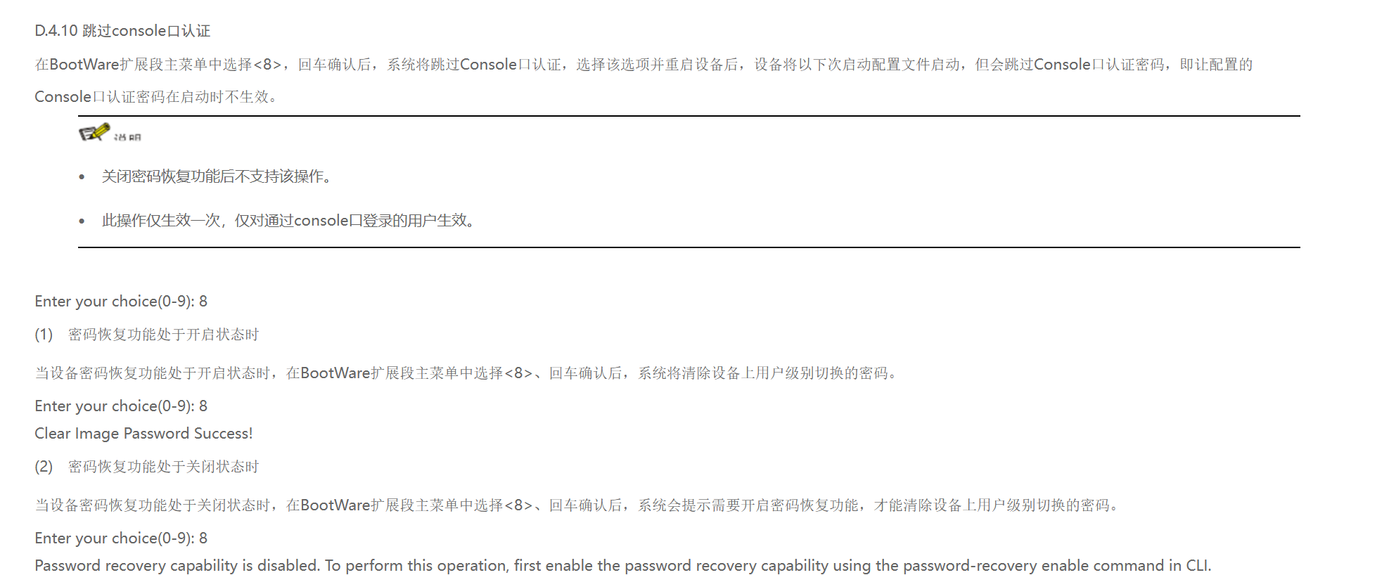 (1) 系统出现如下提示信息表明临时清除Console口登录认证密码成功。