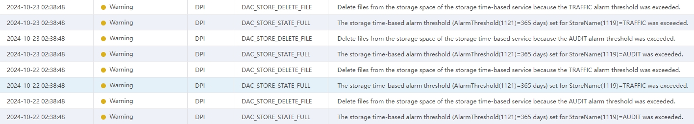 DPI/4/DAC_STORE_STATE_FULL: The storage time-based alarm threshold (AlarmThreshold(1121)=30 days) set for StoreName(1119)=Audit was exceeded.