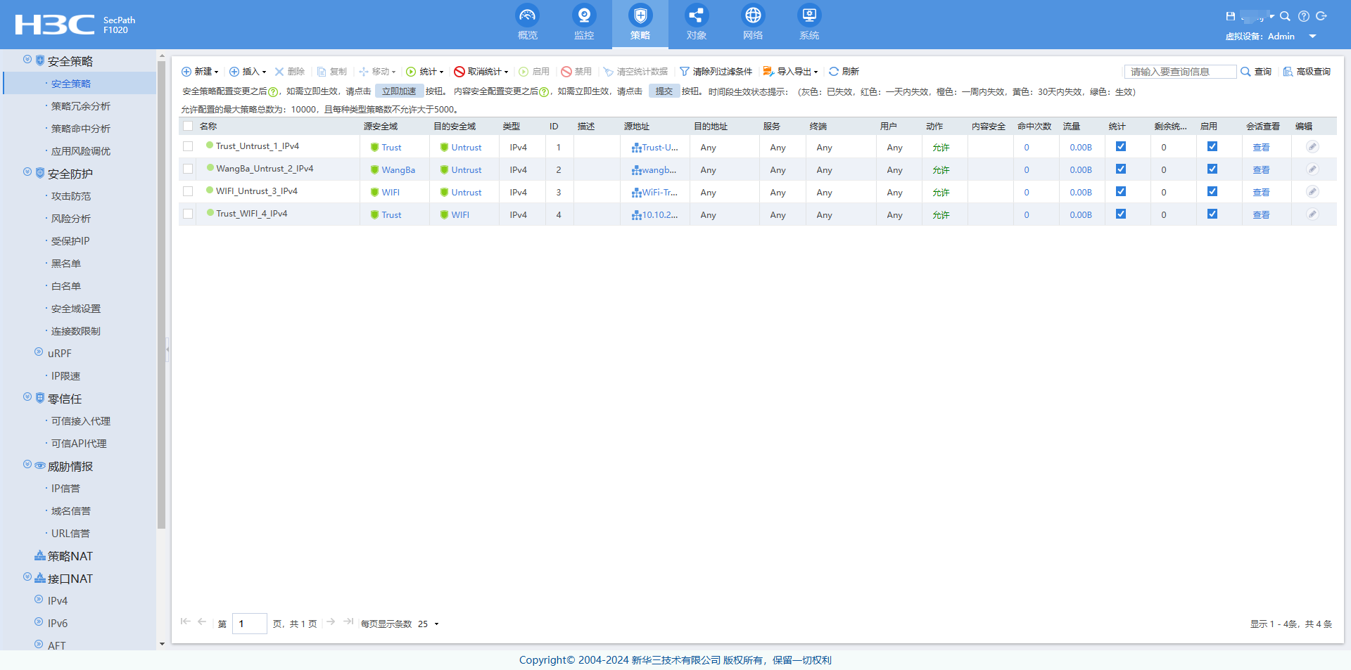 老版本是域间策略,新版本web显示的是安全策略,可以找个没业务的时间配置域间策略转换安全策略,安全策略默认关闭,需要开启安全策略 undo security-policy disable