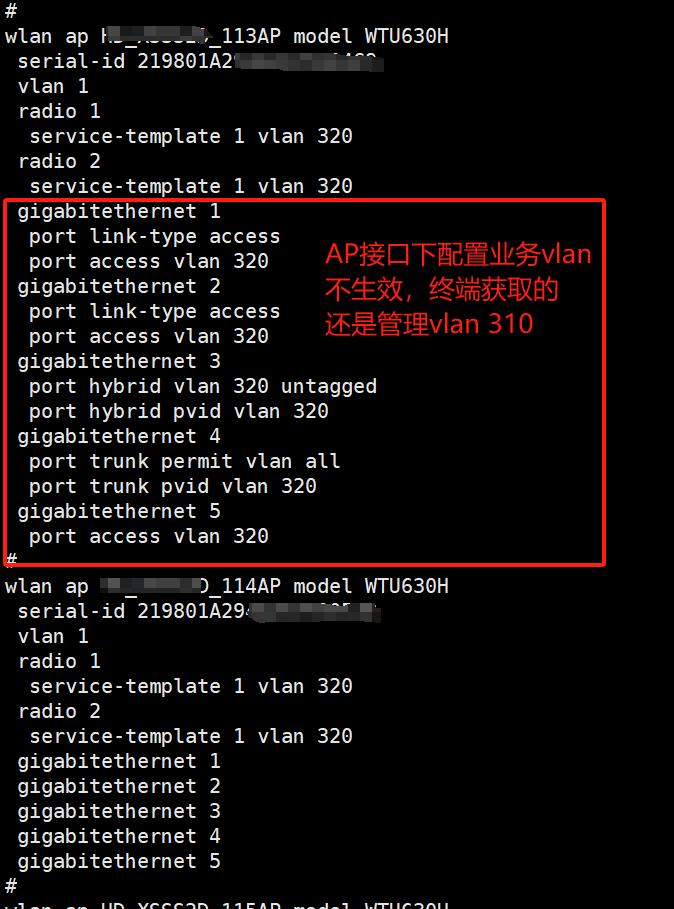 wifi业务正常,AP接口下配置业务vlan不生效,终端接有线获取的还是交换机上pvid的管理vlan。