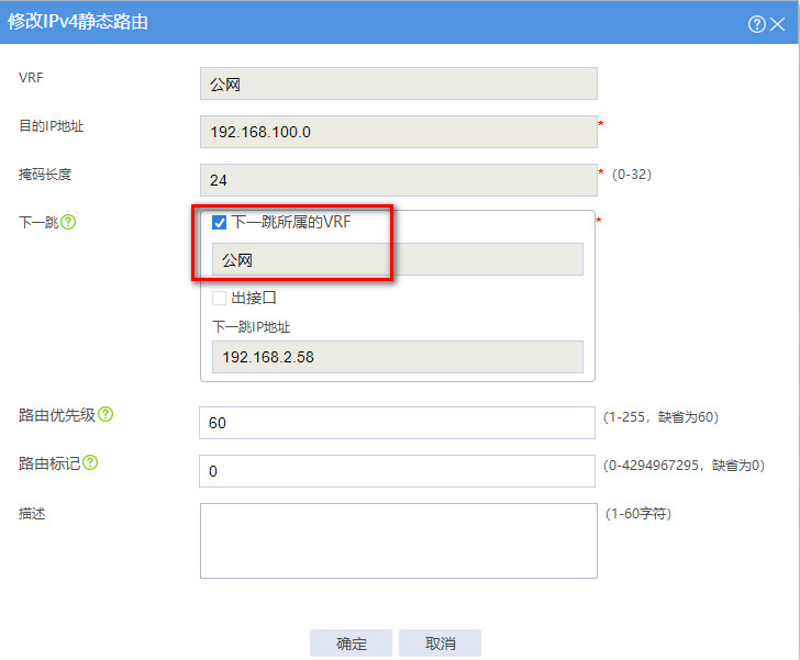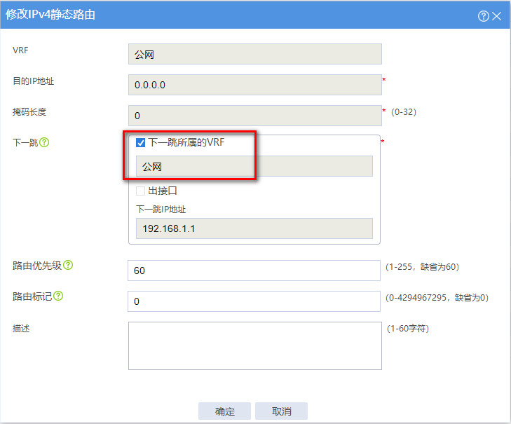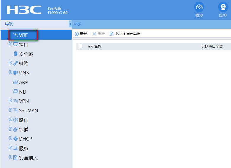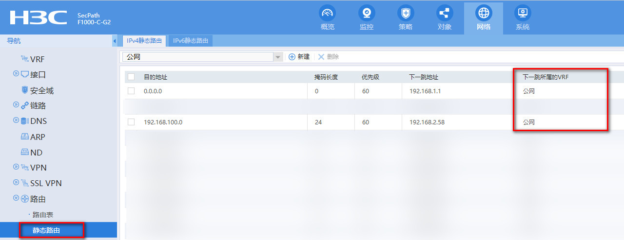 防火墙F1000-C-G2的VRF菜单里是空白的,但在配置静态路由时,去往外部和内部的路由都勾选了下一跳所属的VRF,这个选项是什么意思?不勾选有什么影响?