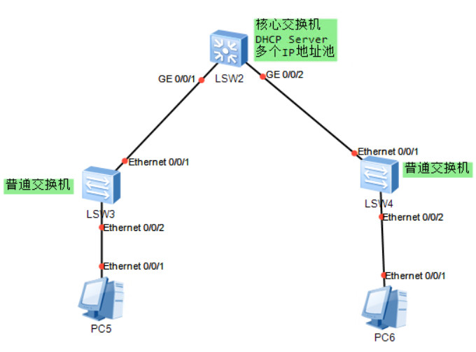 接口设置:下层的普通交换机(无管理功能)连接到核心交换机的接口上应该设置为信任端口,因为它们将会传递DHCP报文。