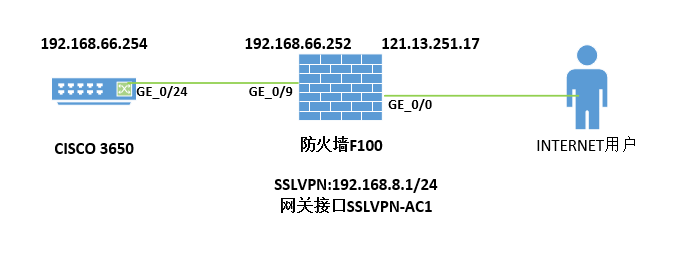 F100防火墙内网接口1/0/9接cisco 3650核心交换机,外网接口1/0/0作为外网上网。现外网用户通过访问防火墙外网口的121.13.251.17地址加端口4433拨入SSLVPN,获取192.168.8.0网段地址后,能访问内网防火墙IP192.168.66.252,但不能访问核心交换机192.168.66.254和内网的设备。