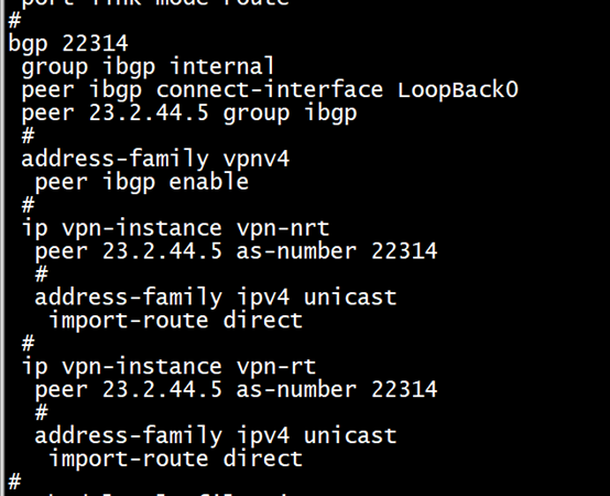 现场BGP配置,PING主站23.2.44.5通,指令查看BGP状态是Established,OSPF也起来了,就是业务不通