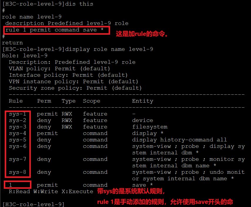 role name level-9 rule 1 permit command save *