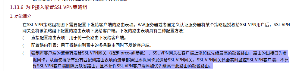 我明白你意思,就是说,当员工在家使用SSL VPN ,只能访问内网,不能访问互联网对吧,H3C的防火墙 有个功能是可以把 SSL VPN 出局互联网的流量强制引流 到公司出口出局,把这个配置上以后