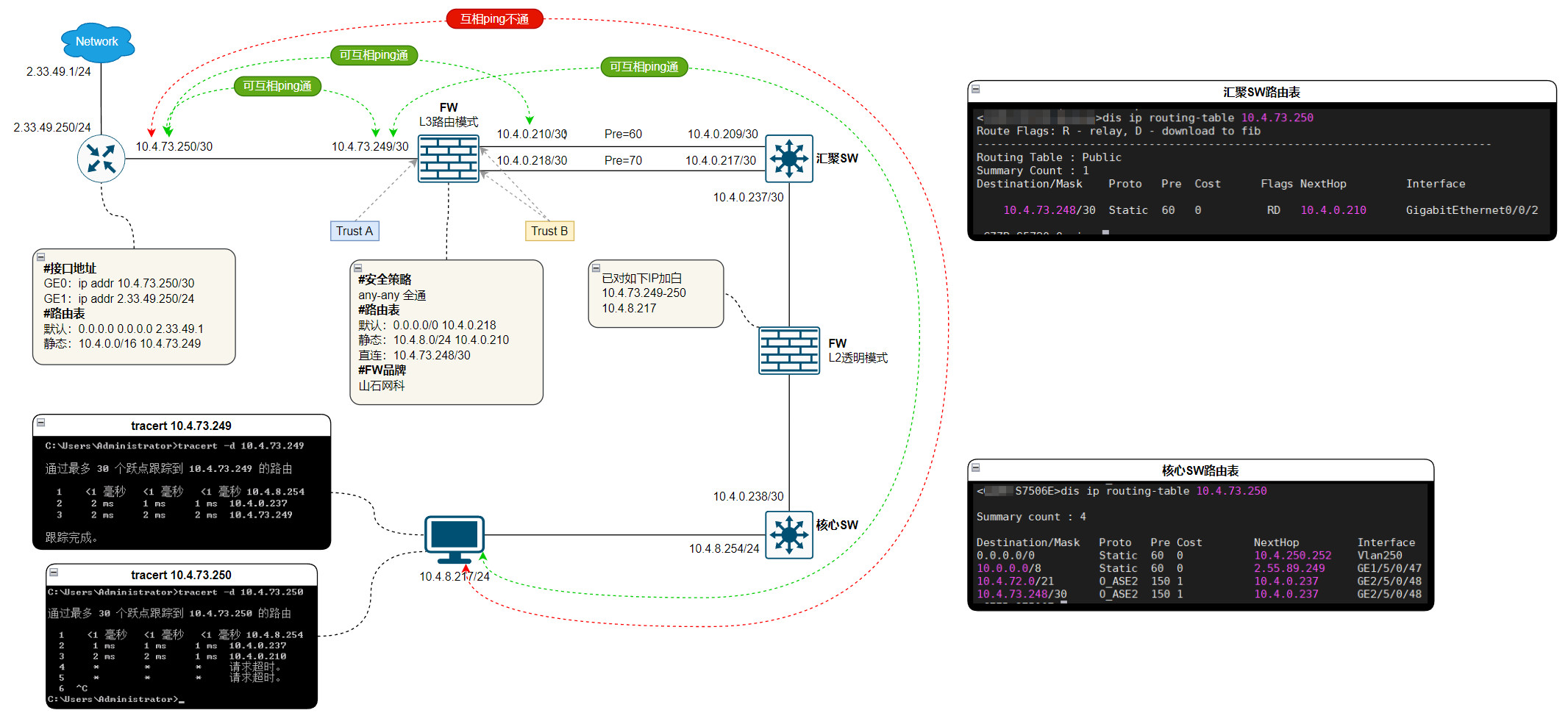 你这个L3的FW和汇聚之间的路由下一跳是不是错了