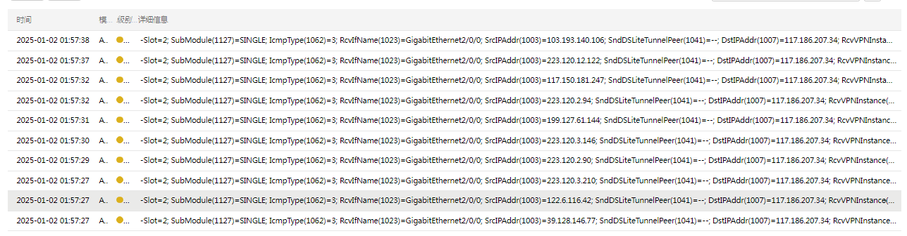 -Slot=2; SubModule(1127)=SINGLE; IcmpType(1062)=3; RcvIfName(1023)=GigabitEthernet2/0/0; SrcIPAddr(1003)=111.2.208.36; SndDSLiteTunnelPeer(1041)=--; DstIPAddr(1007)=117.186.207.34; RcvVPNInstance(1042)=; Action(1053)=logging,drop. -Slot=2; SubModule(1127)=SINGLE; IcmpType(1062)=3; RcvIfName(1023)=GigabitEthernet2/0/0; SrcIPAddr(1003)=120.230.124.46; SndDSLiteTunnelPeer(1041)=--; DstIPAddr(1007)=117.186.207.34; RcvVPNInstance(1042)=; Action(1053)=logging,drop.