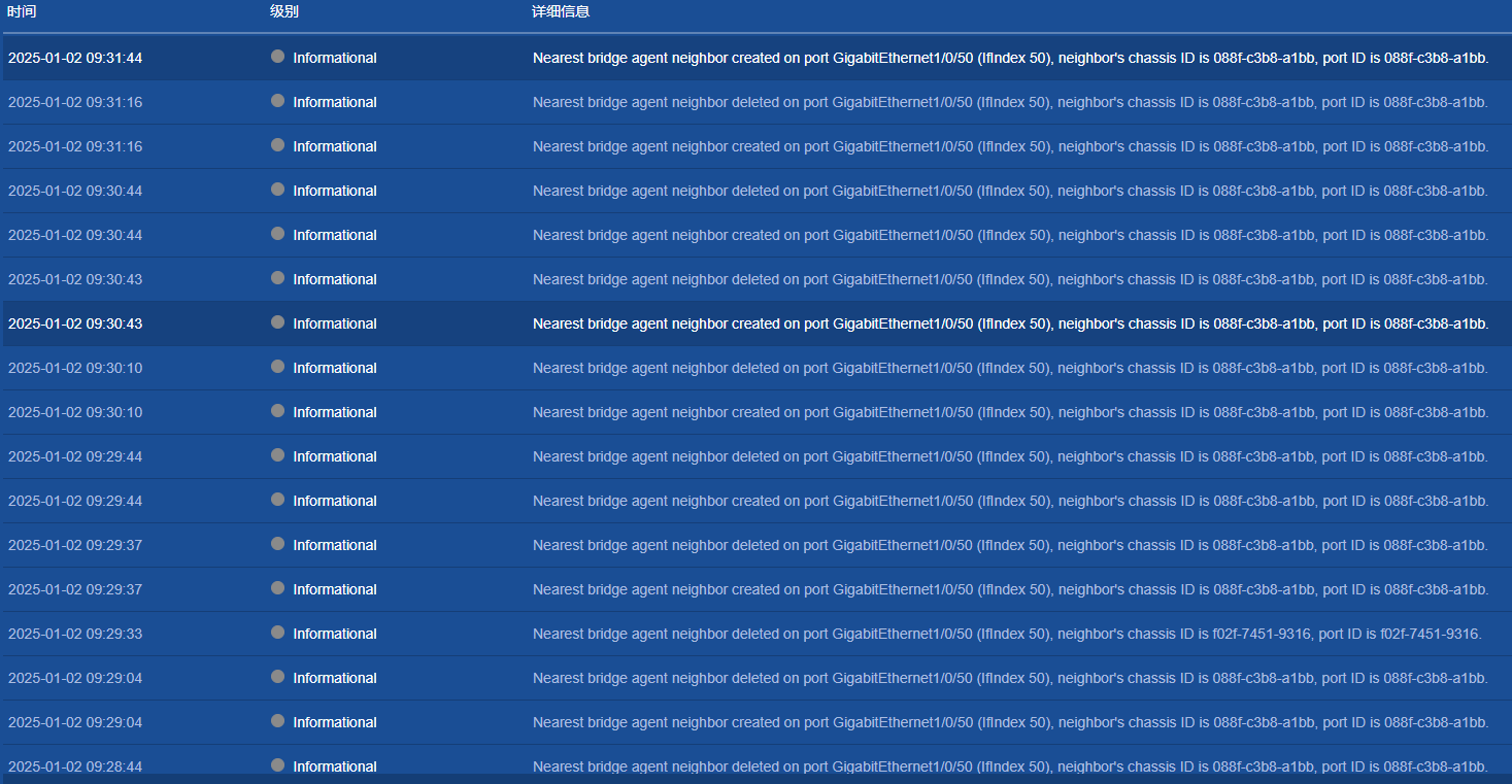 在您描述的情境中,S5048PV5端口持续接收来自同一MAC地址的LLDP(Link Layer Discovery Protocol)报文,这可能表明网络中存在配置或设备兼容性问题。LLDP报文的频繁接收,尤其是当它们来自同一源MAC地址时,可能指示网络中存在以下几种情况: