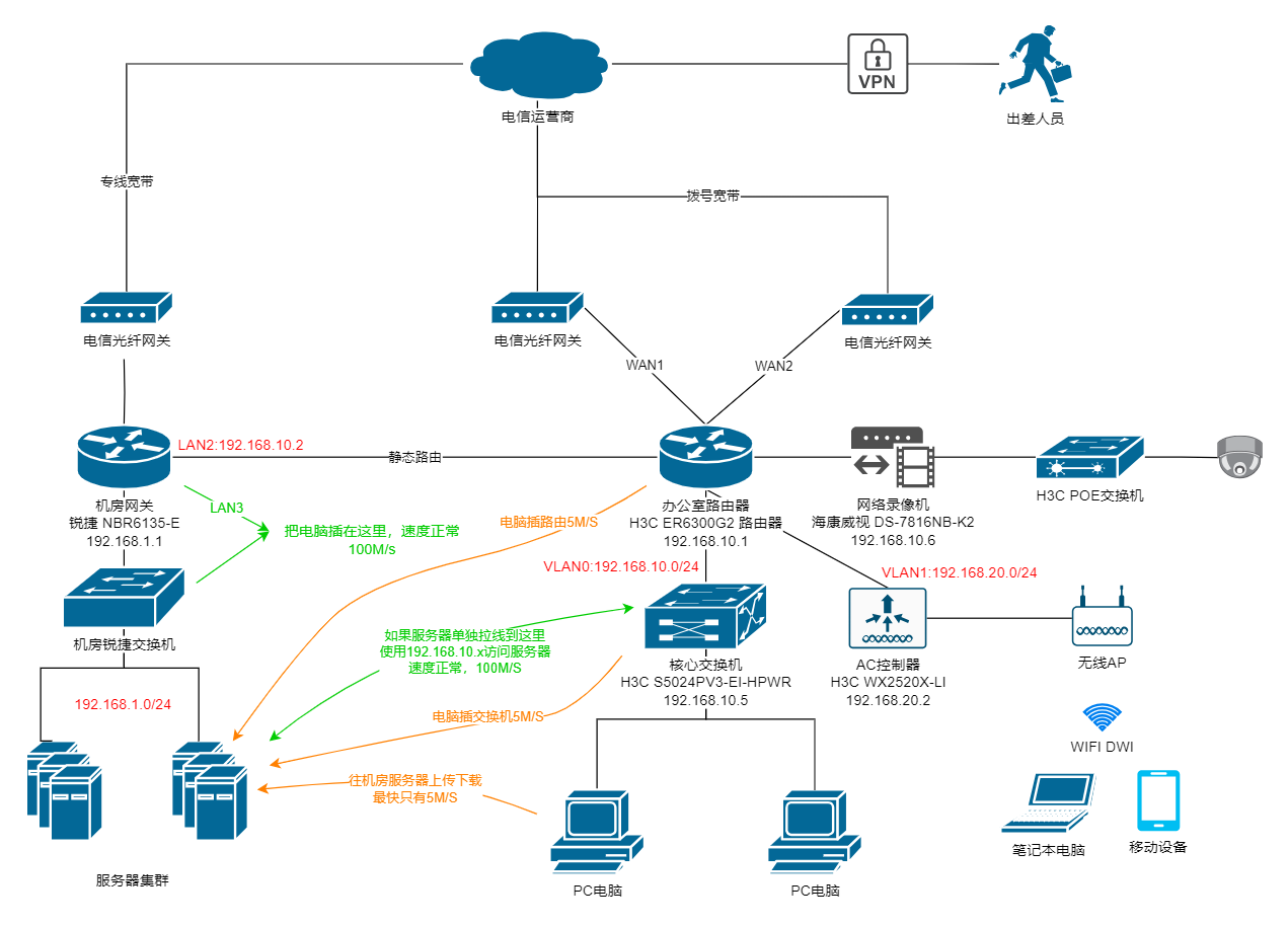 拓扑如上,问题就是电脑通过机房内网上传和下载文件速度只有5M/S左右,我目前怀疑是H3C ER6300G2 路由器问题,路由器上QOS流控都是关闭的,请问有什么排查思路?