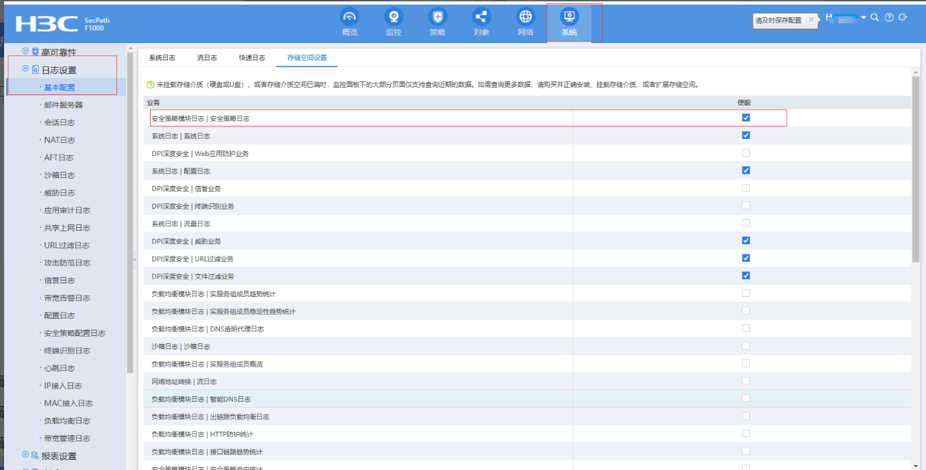 系统-日志设置-基本配置-业务-安全策略日志这边还需要使能