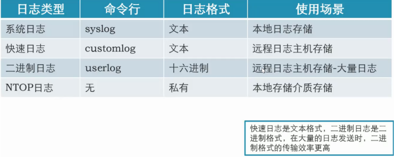 日志内容可以是安全策略日志、流量日志、会话日志、NAT日志、IPS/AV日志等