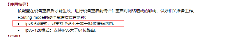 看命令描述仅是硬件资源模式,不知道是不是在ipv6-64的模式下,大于64位的路由需要通过软件算法来计算,还是ipv6-64模式不会接收大于64位的路由呢。