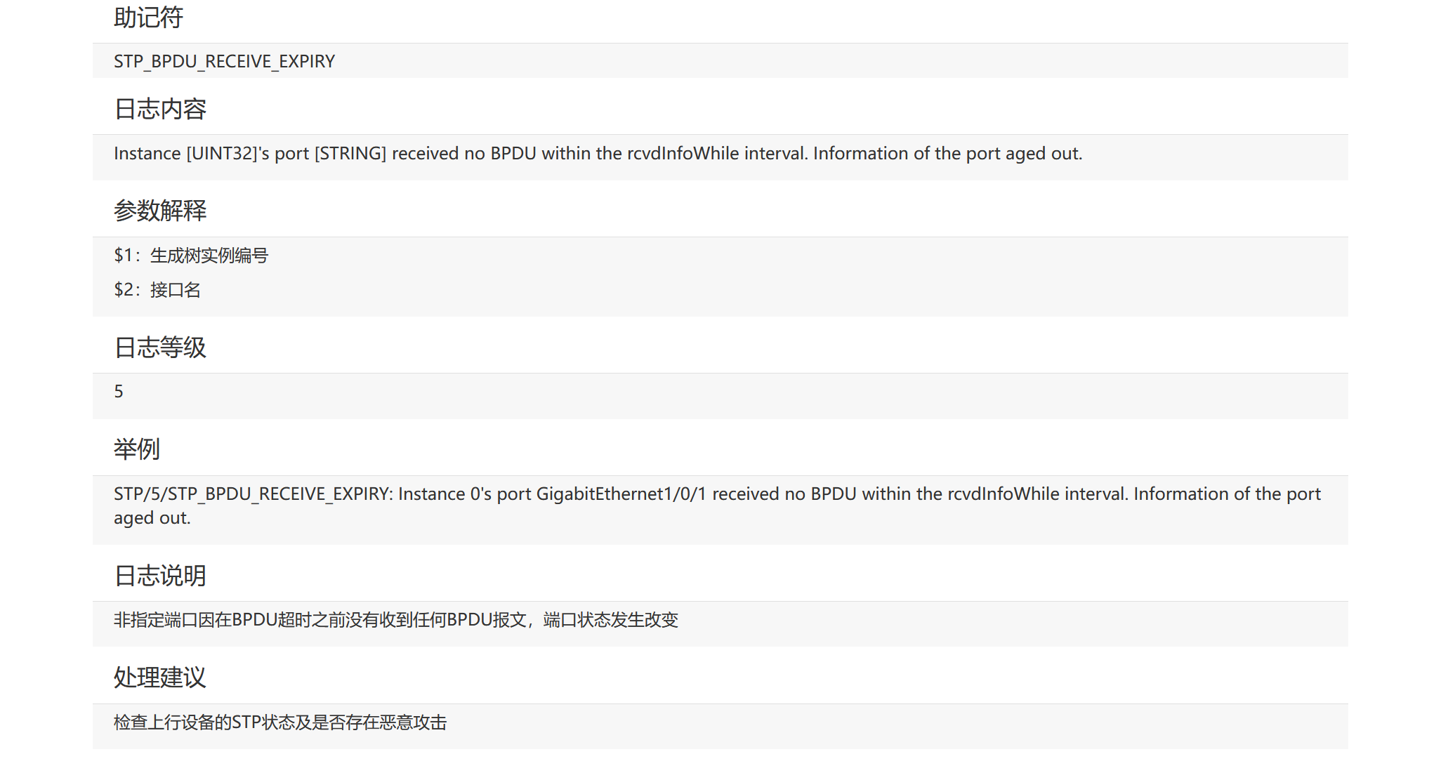 日志含义这表示实例0的GigabitEthernet1/0/1端口在超时前没有收到BPDU,从而导致端口信息老化。日志等级为5(Notification),表示这是一条通知级别的日志,通常不会对系统有直接影响。