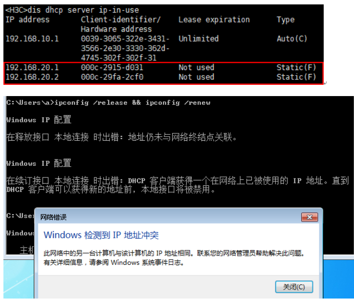 PC1手动设置成PC2的IP地址后,PC2再通过DHCP获取IP时,会发送免费的ARP探测吧?如果检测到同网段内PC1已经占用了他的IP地址,还是会提示IP冲突吧?这些动作, 以上的配置会阻拦吗?