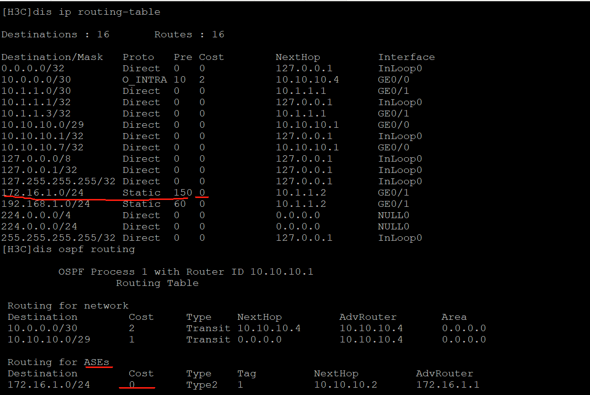 静态的默认优先级是60,ospf外部路由是150 ,我为了让优先级都一样,我手动改了静态路由的优先级为150。