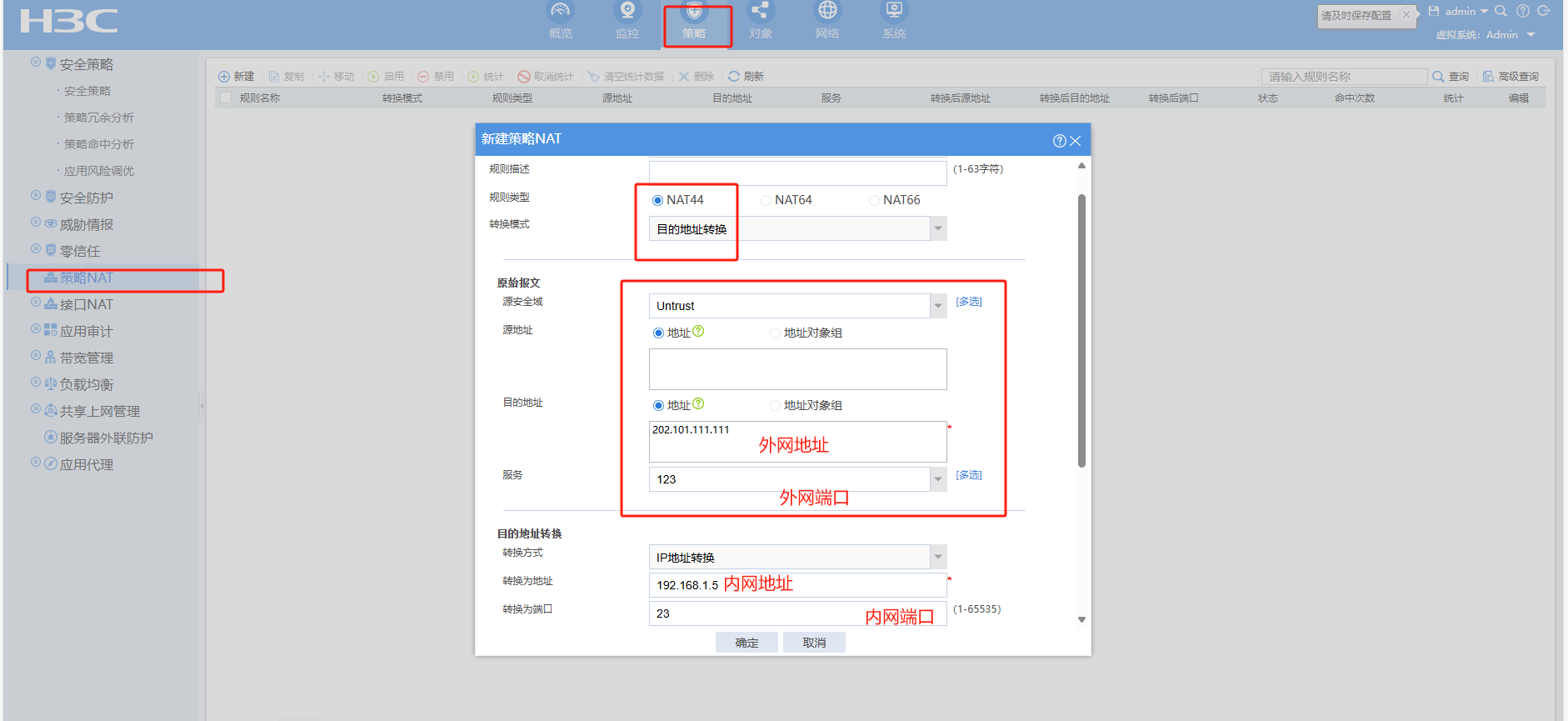 #选择“策略”>“NAT”>“NAT内部服务器”>“策略配置”点击“新建”,“接口”选择外网口1/0/1,“协议类型”选择6(TCP协议),“外网地址”填写1/0/1接口真实地址,“外网端口”填写要发布的8081端口,“内网服务器IP地址”添加真实服务器地址,“内部服务器端口”填写8081端口