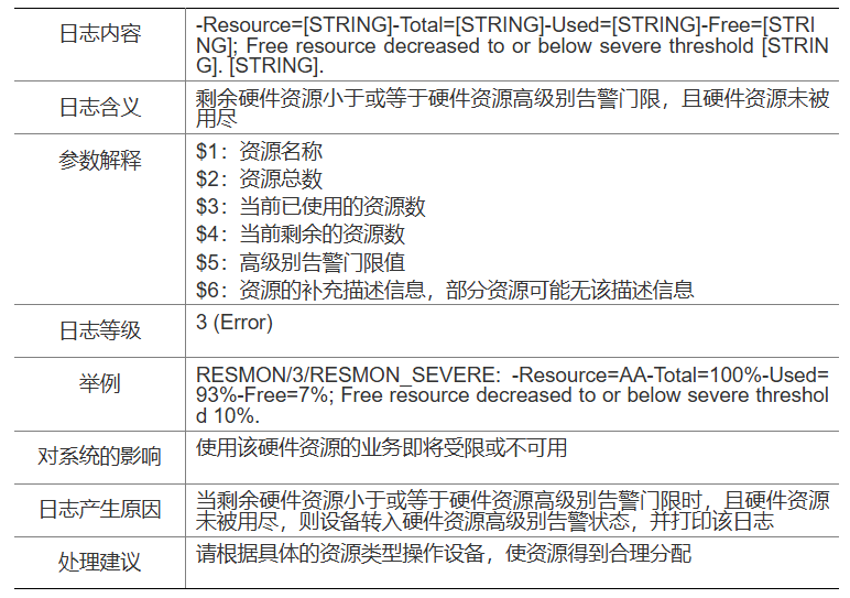 日志说明 | 当资源剩余值小于或等于低级别告警门限时,资源进入低级别告警状态,并定期输出该日志 |