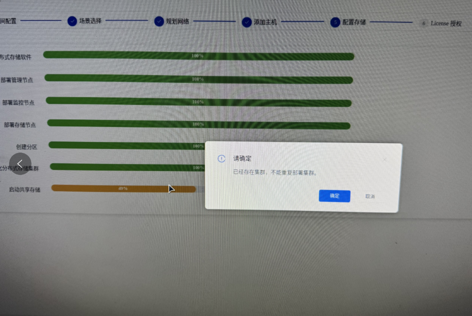 超融合架构开局部署,集群名称默认未填写,网络与终端主机环境正常下开局出现已经存在集群,不能重复部署集群报错,无法初始化