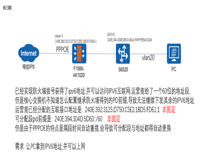 问题:由于运营商下发ipv6地址是动态的,当运营商ipv6前缀变化后,会导致核心交换机与路由器之前手动定义的ipv6互联地址和核心交换机业务网段的ipv6地址需要重新进行定义,针对这种情况该如何解决呢