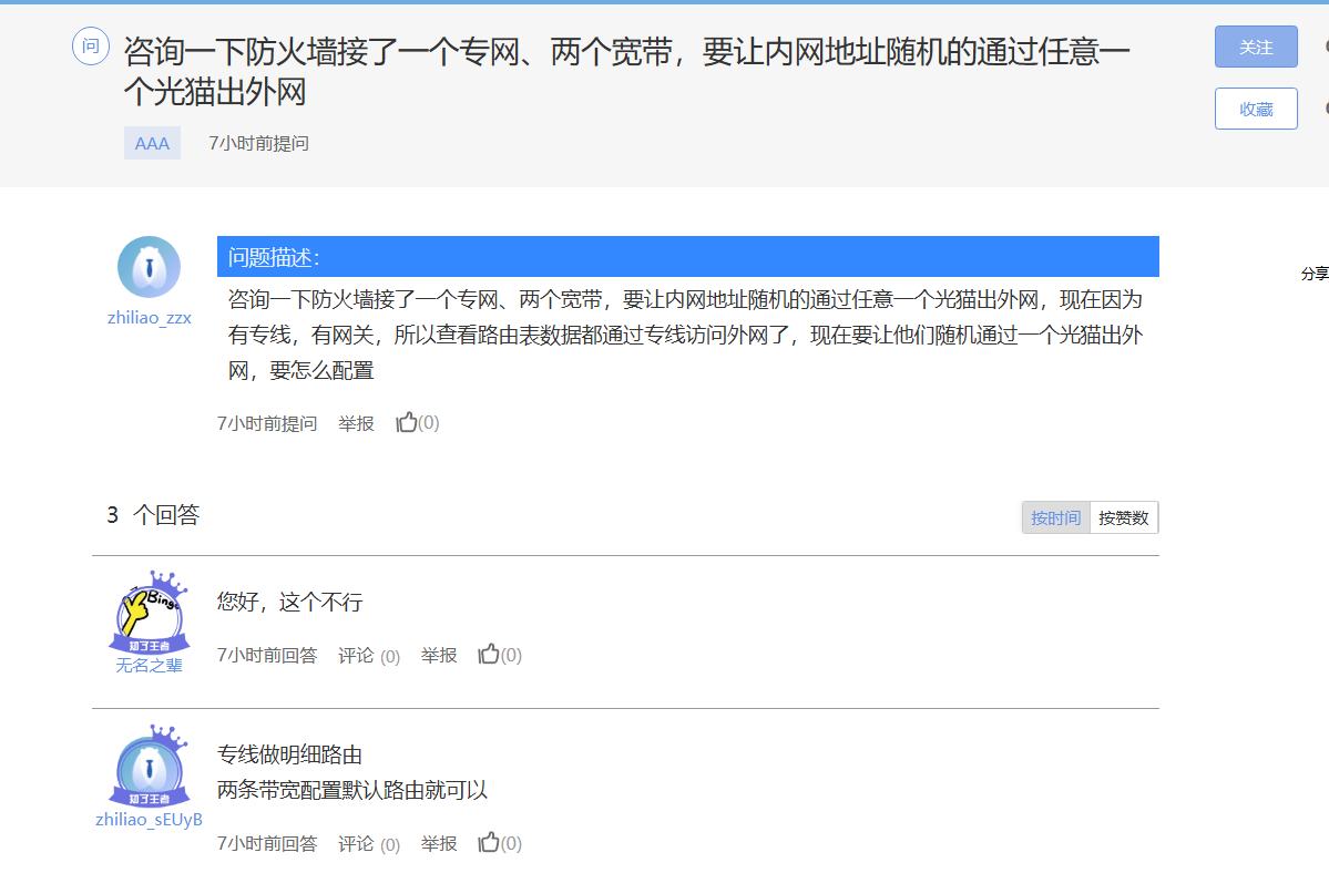 咨询一下防火墙接了一个专网、两个宽带,要让内网地址随机的通过任意一个光猫出外网,现在因为有专线,有网关,所以查看路由表数据都通过专线访问外网了,现在要让他们随机通过一个光猫出外网,要怎么配置