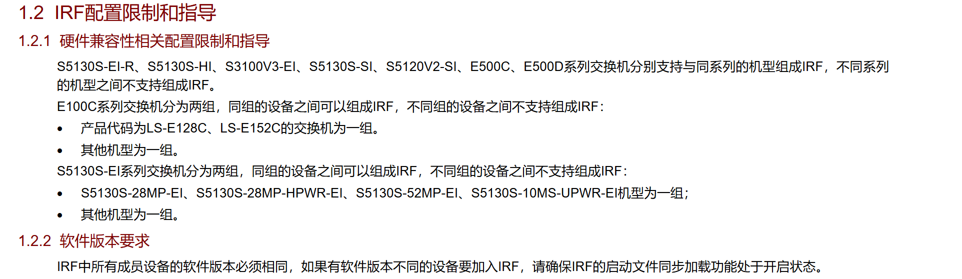 S5130S-EI-R、S5130S-HI、S3100V3-EI、S5130S-SI、S5120V2-SI、E500C、E500D系列交换机分别支持与同系列的机型组成IRF,不同系列的机型之间不支持组成IRF。