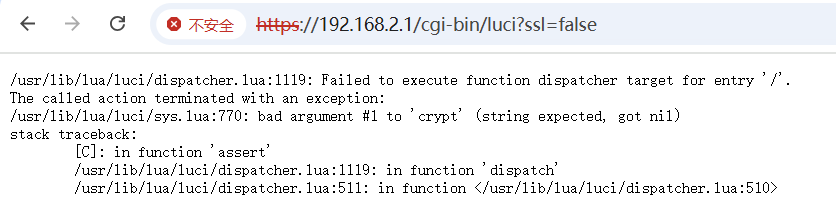/usr/lib/lua/luci/dispatcher.lua:1119: Failed to execute function dispatcher target for entry"/Ihe called action terminated with an exception:/usr/lib/1ua/luci/sys.lua:770:bad argument #l to crypt’(string expected, got ni1)stack traceback: