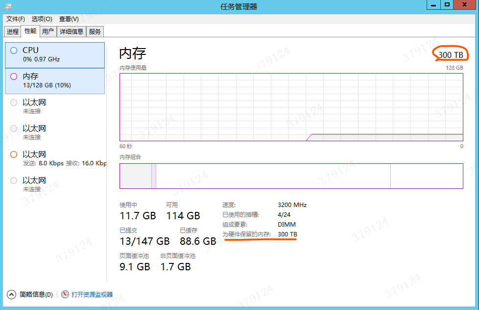 H3C R4900G3服务器安装2012R2系统,任务管理器中显示为硬件保留的内存是300T,内存一开始安装的是32GB 2RX4 DDR4 3200的内存